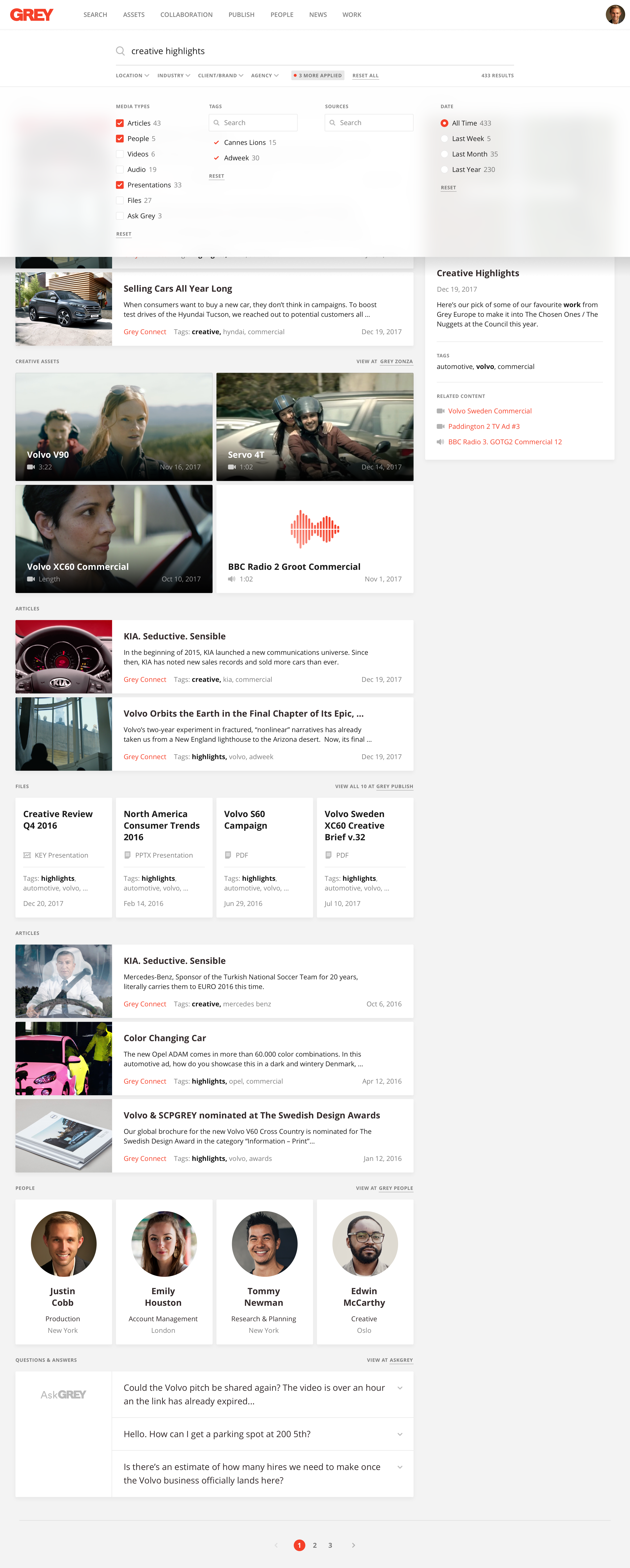 Grey is a global advertising and marketing agency headquartered in New York City. The unified search platform allows employees to find company assets quickly. I also created the design system to support the further improvements of internal company services with consistent experience.