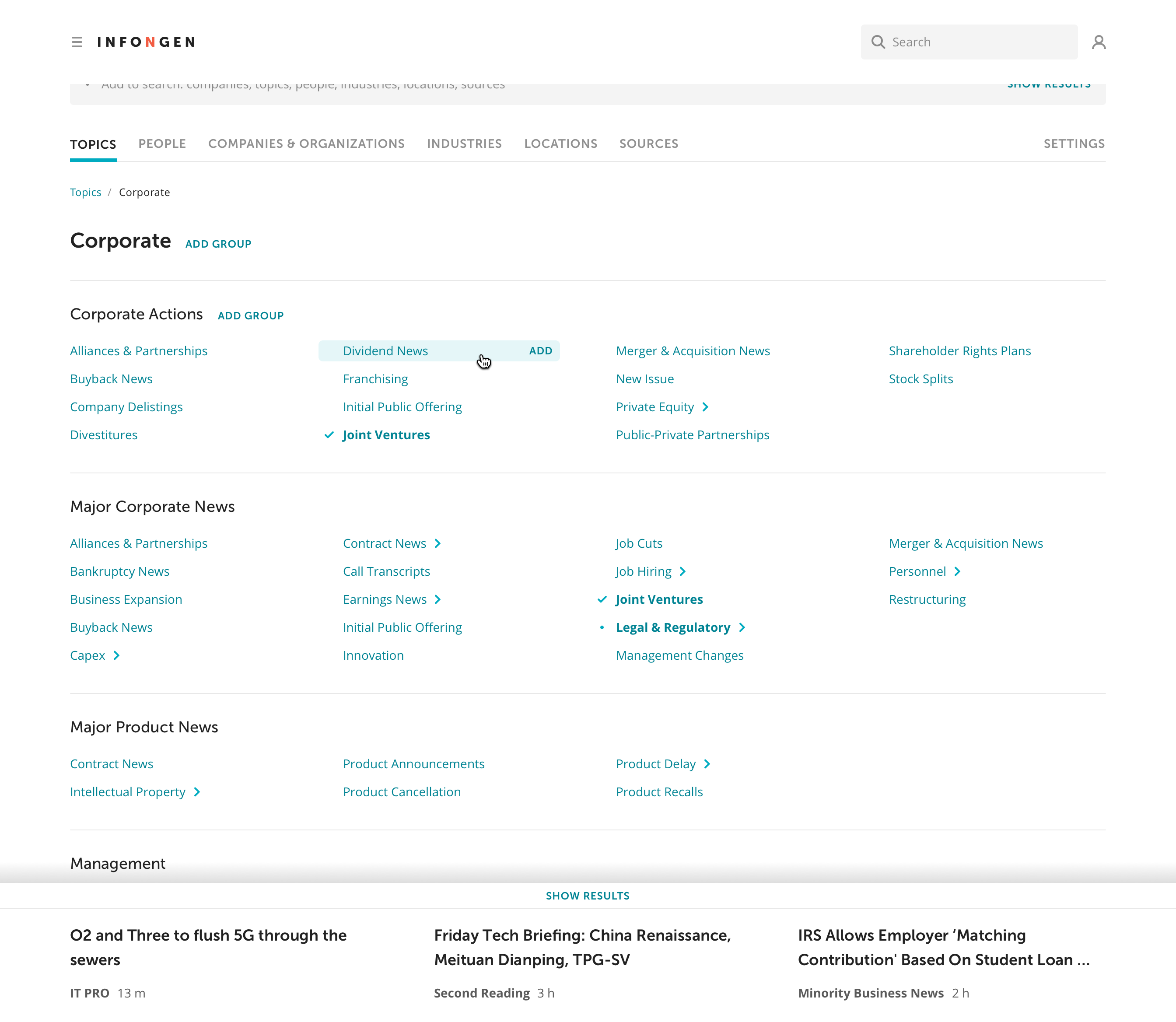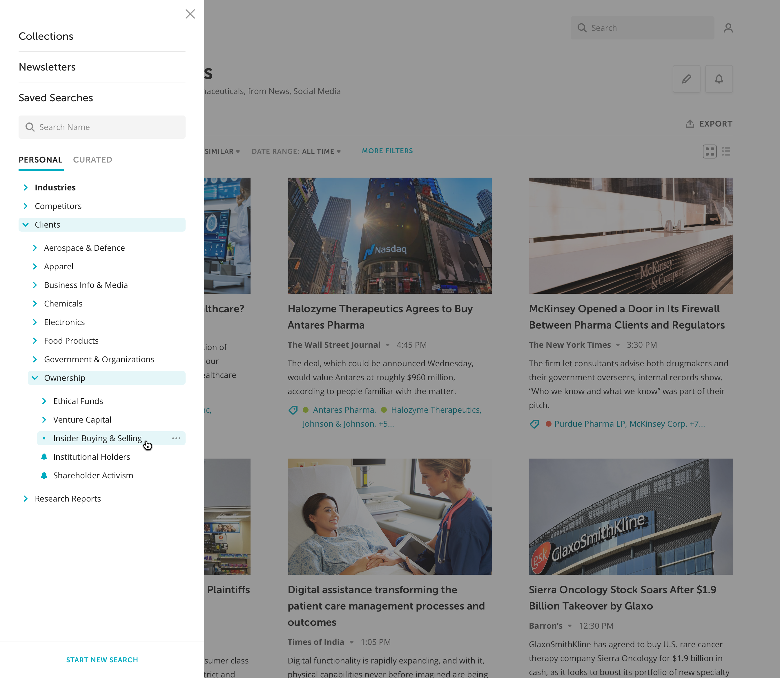 Let's assume, that you need to stay informed about acquisitions made by your company's competitors. For that, you can set up a search query with smart keywords such as Alliances & Partnerships, Mergers & Acquisitions, and companies of interest. The result will be a curated list of articles that you can research or assemble into an email newsletter for your peers.