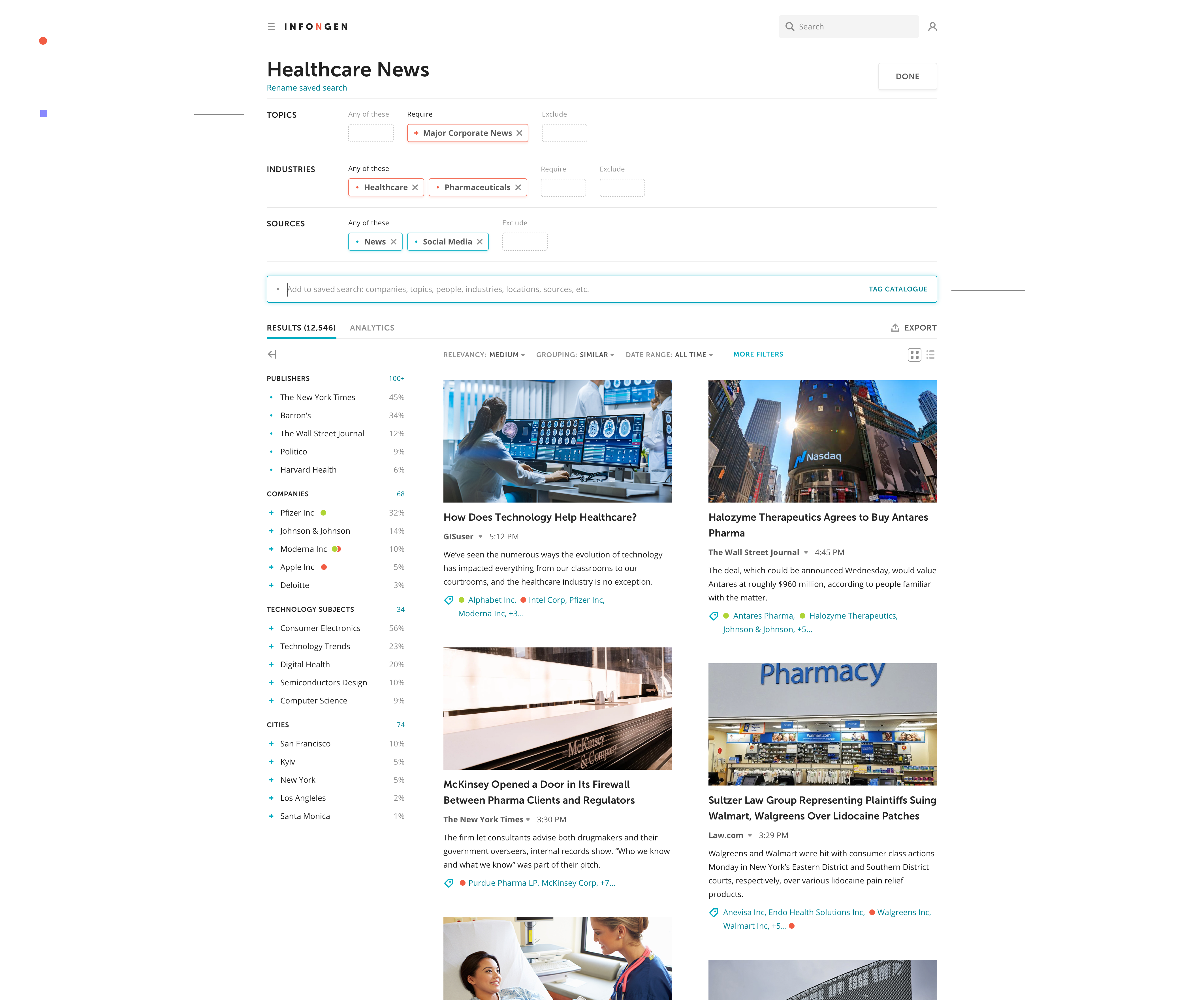 As the primary instrument, InfoNgen ('Info-Engine') utilizes tags, or smart keywords—pre-defined search queries with complex logic under the hood.