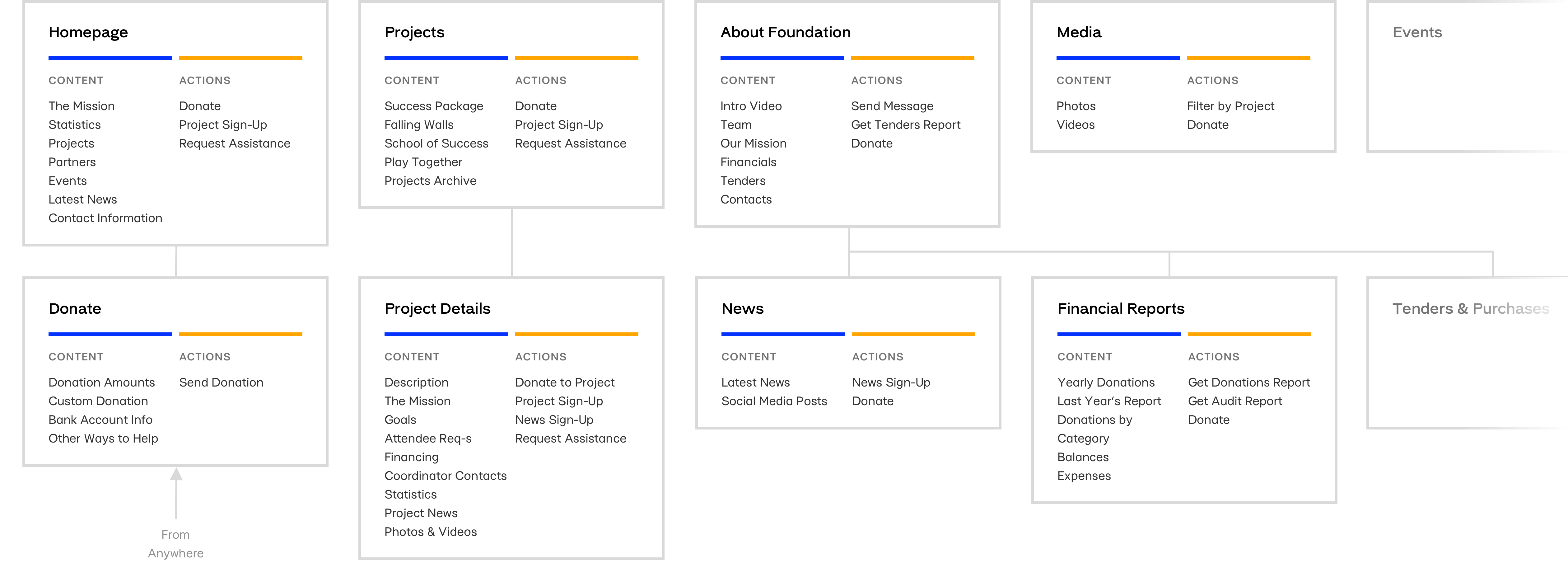 Many people found charity websites confusing. Yet, we needed to show a lot of information. So I created an information architecture map of the website, describing which content each page would have. This helped to make the website navigation more straightforward from the beginning.
