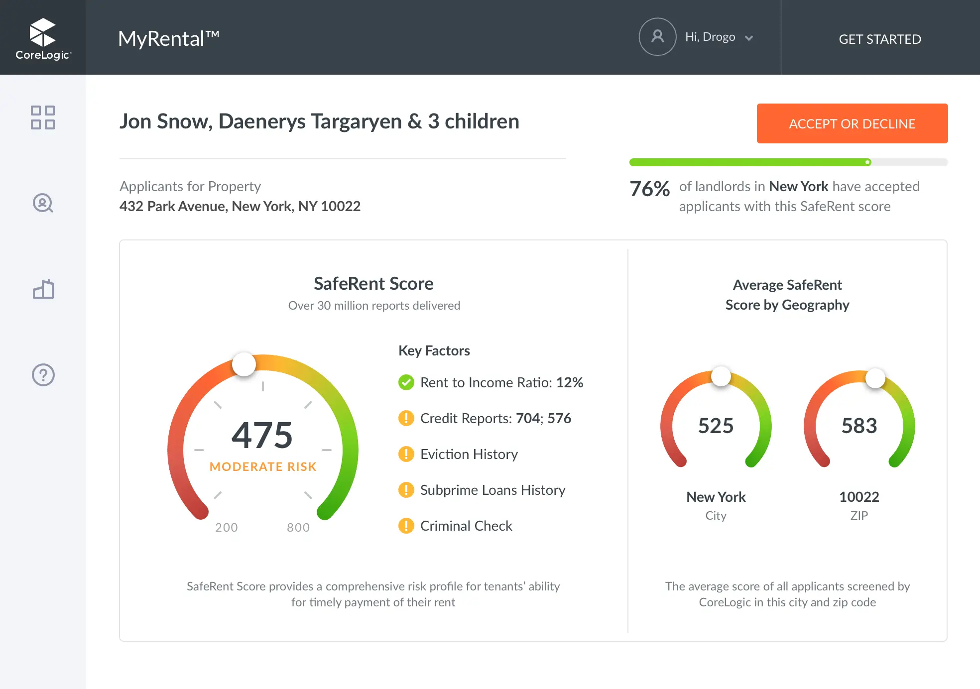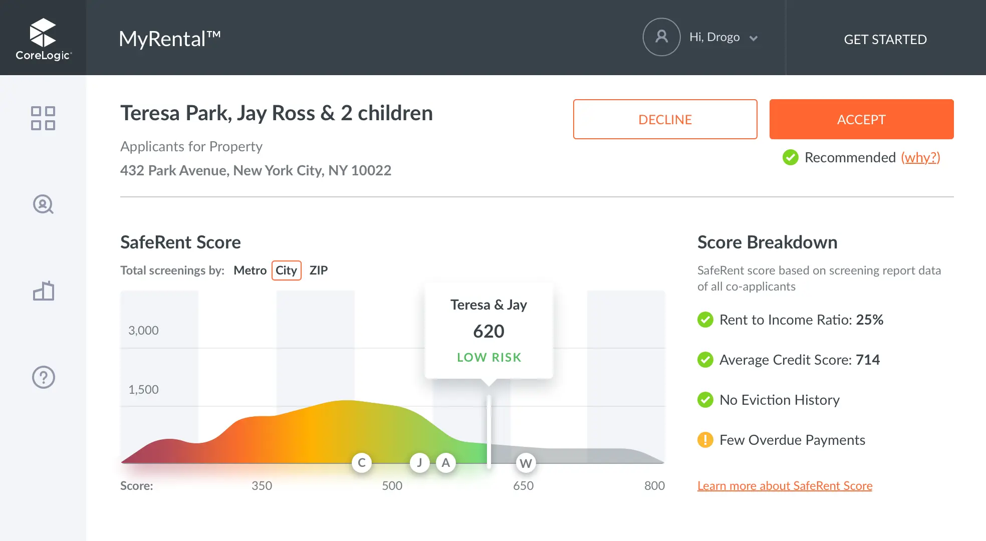 Lease Decision is the primary page for landlords. The goal is to demonstrate a SafeRent score and background check information about co-applicants. The SafeRent score summarizes a potential risk of leasing a property based on several data points. A higher score tends to predict more reliable tenants.